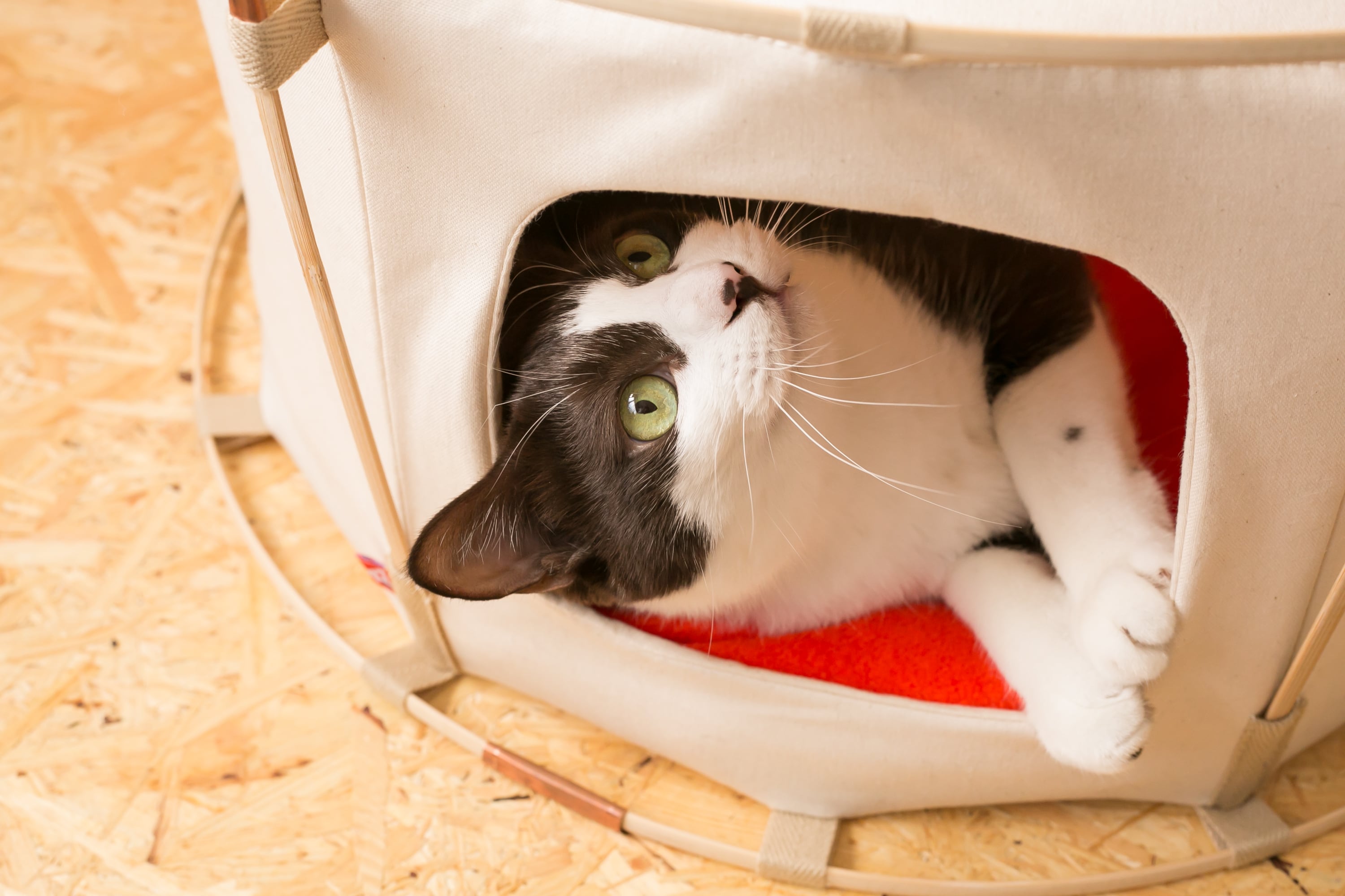 #catstudyhouse theGIANTは、猫はもちろん、様々な動物にお使いいだけるペット用テントです。 軽量な組み立て式でキャンパス地に竹の構造という従来品の猫用テント#catstudyhouseの質感はそのままに、室内空間を拡げて床を設けた安らぎに特化した商品となります。 また、今商品では犬を飼っていらっしゃる方の、自宅で気軽に洗濯が出来ればという声にお応えして従来の革パーツは強度に優れたアクリルに変更しております。